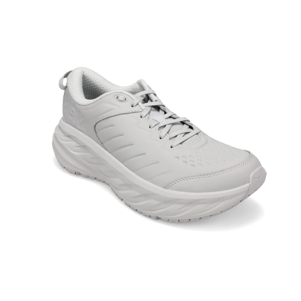 One of the first line extensions of the beloved Bondi family, the new Bondi SR takes the most cushioned shoe in the HOKA road-shoe lineup and reworks the silhouette to handle the demands of daily life. Engineered with an EVA midsole for plush, all-day cushioning, this workplace warrior has been updated with water-resistant leather and a slip-resistant outsole. Boasting a proprietary outsole compound tested against industry standards, the Bondi SR features an ultra-grippy, full ground contact rubber that stands up to the service industry and medical field alike.